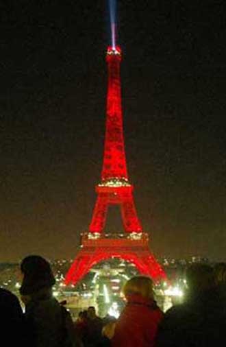 The Eiffel Tower is bathed in red light as Chinese New Year festivities kicked off in Paris, January 24, 2004. The French capital is center of the Year of China cultural exchange season, that includes Chinese art exhibitions, parades, concerts, films and circuses.  [Reuters]