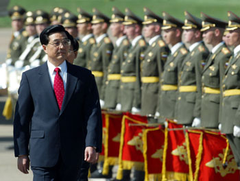 Chinese President Hu Jintao inspects the guard of honour upon his arrival in Moscow's Vnukovo II airport, May 26, 2003. Hu Jintao started his five-day visit to Russia on Monday, which will include