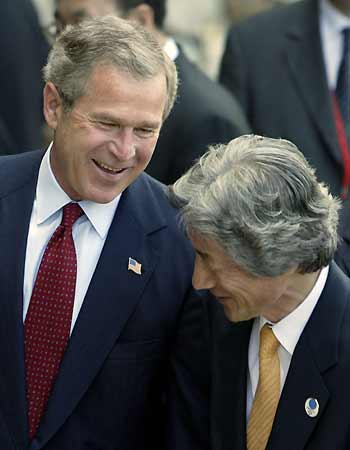 US President George W. Bush (L)smiles with Japan's Prime Minister Junichiro Koizumi at the Royal Parc Evian resort in the French Alps June 1, 2003. President Bush arrived Sunday for his first vis