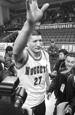 | Menk Bateer, in his No 27 Denver Nuggets jersey, waves to the fans after leading the Beijing Ducks to a victory over city rivals Beijing Aoshen in his last match with the Ducks on Sunday. Nuggets are set to unveil Bateer in Denver today, Beijing time. |
