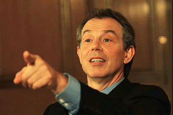 Britain's Prime Minister Tony Blair points during a joint press conference with Chancellor of the Exchequer Gordon Brown, at 10 Downing Street in London, Tuesday June 10, 2003, on Britain not entering Europe's Euro monetary zone at the present time. [AP]