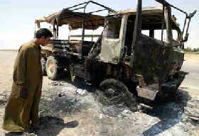An Iraqi looks at the burnt out remains of a US miltary truck on a road near the town of Balad June 16, 2003. A US military convoy was ambushed on a highway near the restive Iraqi town of Balad on Sunday, setting a truck ablaze after apparently being hit by a rocket-propelled grenade. [Reuters]