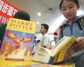 A Chinese girl looks at a copy of 'Harry Potter and The Order of the Phoenix' at a bookstore in Beijing June 21, 2003. The book went on sale at 8.00am in Beijing, exactly the same time as it was released elsewhere in the world. Though only English language copies of the book, which sells for 178 Yuan (US$21.50), are available in China, the store sold more than 50 copies in the first three hours of sales Saturday. Chinese language copies of the book are to be released in stores in October. [Reuters]