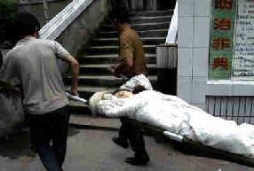 Rescue workers carry a shipwreck survivor on a stretcher to a hospital in Chongqing, southwest China, Thursday, June 19, 2003. [Xinhua]