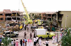 Saudi and foreign citizens gather around the devastated Al-Hamra expatriate housing compound that was hit by a suicide car bombing on May 12, 2003.[AP Photo] |