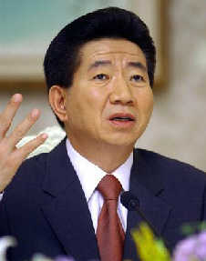 South Korean President Roh Moo-hyun gestures as he speaks about South Korea 's bid to host the 2010 Winter Olympics during a news conference at the presidental Blue House in Seoul, South Korea, June 23, 2003. [Reuters]