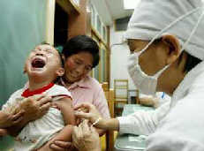 A boy cries as he gets an inoculation for encephalitis B at a children's hospital in Guangzhou, capital of China's southern province of Guangdong, June 23, 2003. [Reuters] |
