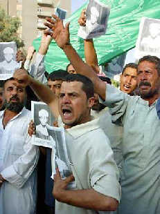 Sunni Muslims in Iraq shout slogans as they gather outside the Palestine Hotel in Baghdad, Iraq on Sunday June 29, 2003, to protest the arrest a sheik by US troops. [AP]