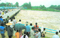 Villagers in the Mengwa Flood Diversion Area in Funan, East China's Anhui Province, watch the floodwather roaring into 12,000 hectares of farmland. [newsphoto.com.cn] |