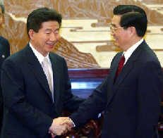Chinese President Hu Jintao (R) shakes hands with South Korean President Roh Moo-hyun after they signed agreements at the Great Hall of the People in Beijing July 7, 2003.[Reuters] |