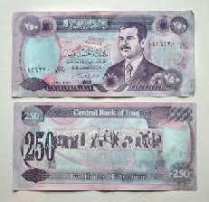 A severe shortage of Iraqi dinars - compounded by the rejection by many Iraqis of the 10,000-dinar note issued just before the war - led US administrators in June to order the printing of millions of new 250-dinar notes, even though they bore Saddam's likeness. The coalition continues to print millions of the old bills every day.