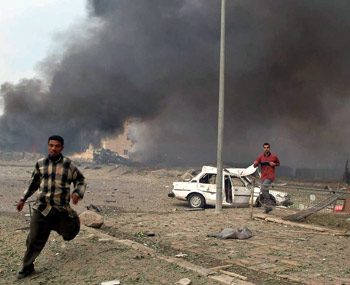 | People run away from the site of a bomb blast in Nassiriya, about 290kms (180 miles) south of Baghdad, November 12, 2003. A car bomb ripped trough an Italian military police base in the Iraq town of Nassirya on Wednesday, killing at least 18 Italians and nine Iraqis in what appeared to be a fresh suicide attack. [Reuters] |
