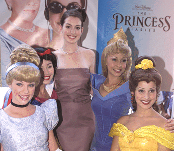 | Actress Anne Hathaway (C) poses with Disney princess characters at the premiere of her new film "The Princess Diaries" in Hollywood July 29, 2001. The comedy film is about a socially awkward 16-year-old girl, portrayed by Hathaway, that discovers that she is the princess of a small European country and takes princess lessons from her grandmother, portrayed by Julie Andrews. The film opens in the United States August 3. [Reuters] |
