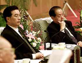 Vice-President Hu Jintao and Vice-Premier Qian Qichen attend a ceremony to commemorate the seventh anniversary of President Jiang Zemin's important speech on the Taiwan question Jan 24.[newsphoto.com.cn]
