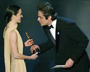 Jennifer Connelly is presented her Oscar for Best Actress in a Supporting Role by Benicio del Torro during the 74th annual Academy Awards in Hollywood March 24 , 2002. Connelly won for her role in "A Beautiful Mind". [Reuters]