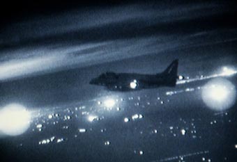 A Royal Air Force GR7 is filmed by a fellow RAF GR7 Harrier pilot as it flies over the oil fields in southern Iraq early in the morning March 18, 2003. Aircraft from the US and Britain are continuing to enforce the no fly zone over southern Iraq. [Reuters]