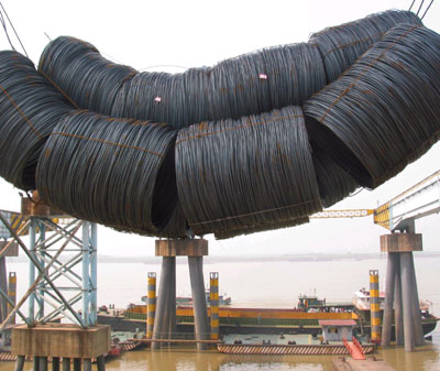 High-speed steel wire made by the Wuhan Iron and Steel (Group) Corp is loaded into a vessel at a port in Wuhan, in Central China's Hubei Province, before embarking for Shanghai Monday. The steel giant has made significant progress in developing high-speed wire in both quality and quantity, exporting more than 5,000 tons of 82B high-speed steel wire to Malaysia and Thailand recently, a move unprecedented in the company's history. [newsphoto.com.cn]
