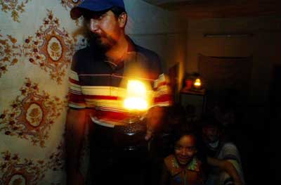 | An Iraqi man leads his children with a gas lamp June 25, 2003, as they go to bed on the roof of their house due to the oppressive heat inside. Much of Baghdad has gone without water or electricity in recent days, adding to the hardship of people coping with severe unemployment and a lack of public safety. Saboteurs linked to former Iraqi leader Saddam Hussein have cut off power lines to Baghdad, depriving the war-weary Iraqi capital of electricity, the top U.S. administrator Paul Bremer said on Wednesday. [Reuters] |