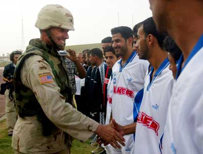 | Colonel Michael Tucker, from Charlotte North Carolina, the commander of the U.S. Army's 1st Brigade, shakes hands with Iraqi soccer players June 24, 2003 before a friendly soccer match in which Iraqis played against soldiers from his brigade. The Iraqi team won 11-0. [Reuters] |