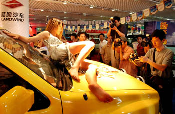 Hello, Babe. A farmer shouldering two baskets of peaches talks with a car model on June 27, 2003 , at the Ningbo Press and Culture Plaza, where a four-day auto show has been held. Ningbo, a coastal city in east China's Zhejiang Province, has very much developed in economy, where quite a number of farmers in the city have become owners of luxury foreign-brand cars. [newsphoto.com.cn]