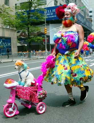 A man dressed in drag walks his poodle during the Gay Pride parade on Fifth Avenue in New York City, June 29, 2003. The parade follows a lavender line painted on the street and ends at Christopher and Greenwich streets in Greenwich village. [Reuters]