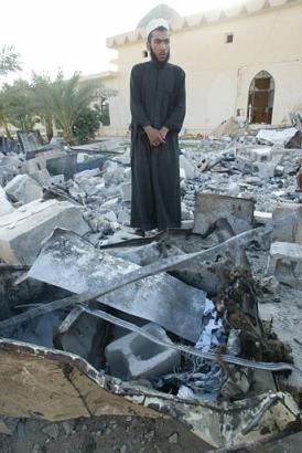 | An Imam (Cleric) stands amidst the ruble of Al-Hassan Mosque in Fallujah, 50 kilometers west of Baghdad, Iraq Tuesday, July 1, 2003 hours after an explosion ripped the mosque killing at least 10. The blast raised tensions in a region already simmering with anti-American activity. [AP] |