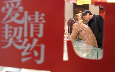 A shop in Hefei, capital city of Anhui Province, invites young lovers to sign "a love contract" on Valentine's Day. More than 100 people have taken part in the event. [newsphoto]