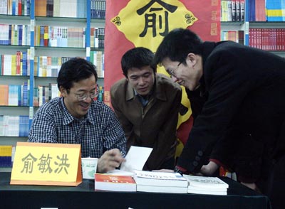 Yu Minhong, founder of the New Oriental Education Group discusses English study with two students at a Changchun bookstore.