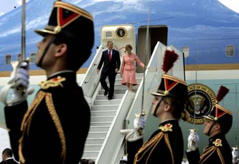 Laura Bush step off Air Force One as they arrive at Orly Airport in Paris,