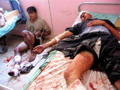 The local hospital was overwhelmed with the casualties. Every bed was filled, forcing many of the injured to sit on the floor amid pools of blood as frantic health workers treated them. One injured man sat against the wall, holding his head in his hands and weeping.