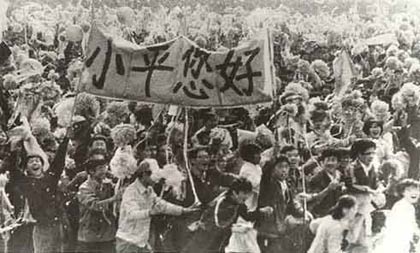 Students of Beijing University hold a banner reading "Hello, Xiaoping" in Chinese during a parade celebrating the 35th anniversary of the founding of the PRC.