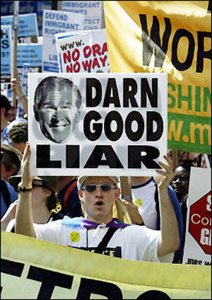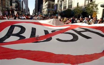 More than 200,000 demonstrators marched past a heavily fortified Republican convention hall on Sunday, chanting denunciations of the administration and the war in Iraq as delegates flocked to the city to nominate U.S. President Bush for four more years in the White House. Vice President Dick Cheney campaigned his way into the convention city three days ahead of the president, praising him as "calm in a crisis, comfortable with responsibility and determined to do everything needed to protect our people." He spoke on Ellis Island, framed by a Manhattan skyline altered irrevocably by terrorism. Bush was in West Virginia, accusing Democratic rival Sen. John Kerry of changing his stand on coal industry issues that are vital to the state's economy. "Be careful of somebody whose position shifts in the wind," he said. Bush presented his standard campaign defense of the war in Iraq, saying, "America and the world are safer because Saddam Hussein sits in a prison cell." But in an interview with Time Magazine, the president suggested he had underestimated the struggle of the postwar period in Iraq. "Had we to do it over again, we would look at the consequences of catastrophic success, being so successful so fast that an enemy that should have surrendered or been done in escaped and lived to fight another day," Bush said. Vice presidential candidate John Edwards responded for Kerry and the Democrats. "President Bush now says his Iraq policy is a catastrophic success. He's half right. It was catastrophic to rush to war without a plan to win the peace," he said. Bush and Kerry are locked in a tight race for the White House, although recent polls suggest momentum for the president. A group of Vietnam veterans have been running commercials accusing Kerry of lying about his decorated service in Vietnam, allegations that official Navy documents dispute and Kerry has denounced as a Republican-driven smear. Still, fellow Democrats concede the unsubstantiated claims may be hurting his candidacy. Polls show the war in Iraq has become increasingly unpopular in recent months, and the throng of protesters filling 20 city blocks on a steamy Manhattan afternoon underscored that. "No More Bush," and "No More Years," were two of the more popular chants. "Bush Lies, Who Dies?," read some of the signs. Several protesters carried flag-draped, coffin-shaped boxes through the streets, meant to draw attention to the U.S. death toll in Iraq. The Pentagon says 969 Americans have died in action, including 831 since Bush stood on an aircraft carrier more than a year ago before a banner that read "Mission Accomplished." Police gave no official crowd estimate of the day's protest. One official put the size at 120,000, although it took nearly five hours for the procession to pass Madison Square Garden. Delegates meet there beginning Monday to nominate Bush and Cheney for second terms. Organizers claimed they had turned out roughly 400,000 protesters. In all, about 100 arrests were reported, with no major outbursts of violence. At mid-afternoon, a small fire erupted along the protest route a half block from the Garden. Police quickly doused the flames, then handcuffed two people and led them away. Thousands of police, some dressed in riot gear, others bearing automatic weapons, watched as the protesters passed. Extensive as it was, the force represented only a portion of an unprecedented security deployment designed to protect the city, New Yorkers and Republicans during the convention week. Homeland Security Secretary Tom Ridge said last week the efforts would include air surveillance over the city, monitoring activity in the harbor and stationing security personnel at every hotel housing any of the 2,508 delegates or 2,344 alternates. After months of appealing to his conservative supporters, Bush and his convention planners scripted a program pitched toward the political middle, independents and wavering Democrats. Sen. John McCain was on the program for the convention's opening night Monday. The Arizona Republican has widespread appeal among independents that stems in part from his own presidential campaign four years ago and his drive for campaign finance reform. California Gov. Arnold Schwarzenegger, who espouses a more moderate brand of Republicanism than the president, speaks Tuesday night. Democratic Sen. Zell Miller of Georgia delivers the keynote address on Wednesday.