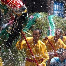 A team of dragon dance performs in spraying water during the Water Dragon Festival, a traditional festival of the Buyi ethnic group, at the Buyi-Miao Autonomous Prefecture of Qiannan, southwest China's Guizhou Province, Sept. 17, 2004. Thousands of local residents and visitors participated in the event and sprayed water to teams of dragon dance as a way of blessing.