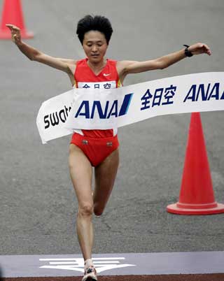 The men's title was won by Kenya's James Moiben in 2:10:42, Tansania's Christphor Isegwe took the second in 2:10:56 and DPR Korea's Ri Kyong Chol finished third in 2:15:24. Sun, 25, stayed in the leading pack throughout the grueling race of 42.195 kilometers starting from the city center's Tian' anmen Square and pulled away in the final kilometers to win the race at north Beijing Olympic Center in a time of two hours 24 minutes and 11 seconds. But the time is a far cry from her personal best of 2:19:39, which was world's second all-time best and was clocked in her winning last year's race. The second and third places in the women's race were also won by China, with Zhou Chunxiu, winner of the Xiamen marathon early this year, taking the second in 2:28:42 and Dai Yanyan winning the third in 2:29:58. Sun, last year's world 10,000m bronze medalist in Paris, was one of China's biggest medal hopefuls in track and field in the Athens Olympic Games but returned home empty handed after competing in the 5,000m and 10,000m. Her training partner Xing Huina surprised all to win the 10, 000m gold medal in Athens but failed to enter today's race. Sun said that two wins after the Olympics will boost her confidence in preparation for the Beijing Olympic Games, although it's four years away. "I feel very excited to win the race," she said. "I was very disappointed back from Athens, but now I will start to prepare for the 2008 Games. To this ends, I will adjust my for and lay a good foundation for the Beijing Olympics. I'm very confident." Sun, who is still recovering from a foot injury, said she was not happy with the results. "The race is tough," she said. "In the first 15 kilometers, there are too many runners in the course. I was unable to speed up. I think organizers have some problems there. "Anyway, I am very satisfied that the long and difficult season finally ended up with two wins." Moiben's win was his second in China following the Xiamen marathon triumph in southeast China's Fujian Province early this year. "I am very happy with the win," a beaming Moiben said. "The Chinese people