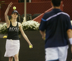A model throws a ball to Spain's Albert Costa during the Madrid's Masters Tennis tournament October 18, 2004. [Reuters]