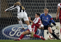 past Bayern Munich's goalkeeper Oliver Khan and Thomas Linke during