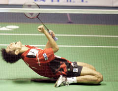 | Lin Dan reacts after winning men's single of