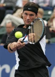 | Lleyton Hewitt of Australia returns a forehand to Carlos Moya of