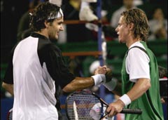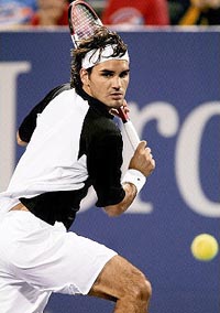 Swiss Roger Federer returns a backhand to Australia's Lleyton Hewitt during