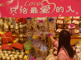 Finely-packed chocolate products, long considered a Valentine's Day necessity, are placed strikingly in a Zhengzhou supermarket. [newsphoto]