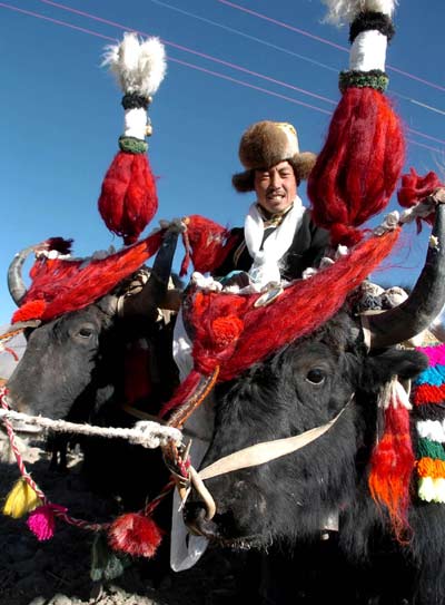 A Tibetan farmer in Naiqiong Village of Duirongdeqing County, in the Tibet Autonomous Region, decorates his oxen on Monday in preparation for a plowing ceremony. The village has witnessed good harvests for 17 consecutive years. [newsphoto] |