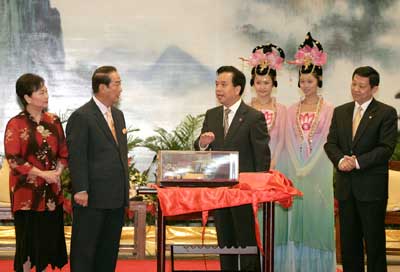 Li Jianguo (4th, right), secretary of the CPC Shaanxi committee, presents a gift to James Soong, chairman of PFP in Xi'an May 5, 2005. [Xinhua]