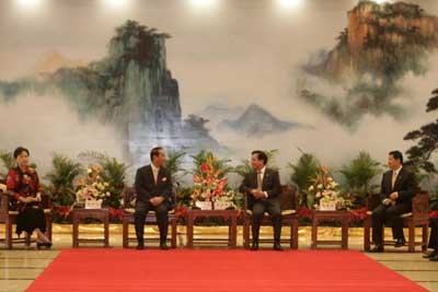 Li Jianguo (2nd, right), holds talks with visiting James Soong, PFP chairman from Taiwan in Xi'an, Shaanxi Province May 5, 2005. Soong arrived in the mainland Thursday afternoon for a nine-day landmark visit. [Xinhua]