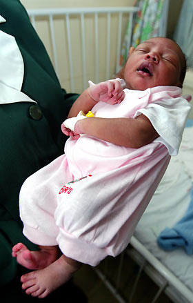 An abandoned two-week-old baby girl christened "Angel" is being carried at the Kenyatta National hospital in Nairobi May 10, 2005. [Reuters]