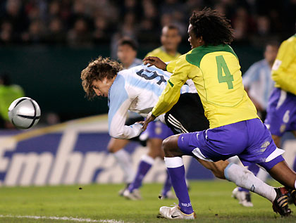 Argentina's Hernan Crespo (C) watches as the ball he headed enters the goal to score past Brazil's goalkeeper Dida (R) in the first half their soccer World Cup qualifying match in Buenos Aires, June 8, 2005. Defending the goal are also Brazil's Roque Junior (2nd L) and Roberto Carlos (L). Argentina beat Brazil 3-1. [Reuters]