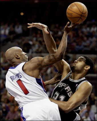 fouled by Tim Duncan of the San Antonio Spurs second half of game game