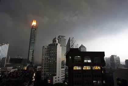 Storm clouds gather over China's Shanghai municipality in the afternoon of June 28, 2005. Shanghai was hit by a torrential downpour in the afternoon that dumped 2.36 inches (60 millimeters) of water on the business metropolis. Shanghai weather at this time of the year is characterised by long heat spells broken only by short bursts of torrential rain. [newsphoto]