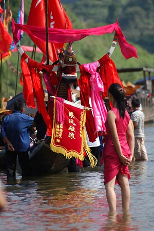 A girl watches as ethnic Miao racers prepare to compete in the Miao Dragon Boat Festival on the Qingshui River in Shidong township, Guizhou province, July 2, 2005. [newsphoto]