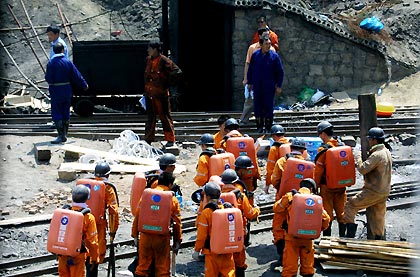Rescuers prepare a searching mission before a coal mine pit at the Shenlong coal mine in Fukang county, northwest China's Xinjiang Autonomous Region July 11, 2005. [newsphoto]
