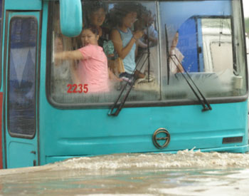A bus steams forward on a flooded street in Jinan, East China's Shandong Province July 12, 2005. Sudden and heavy rainfall led to the flooding of some streets in the city. [newsphoto]